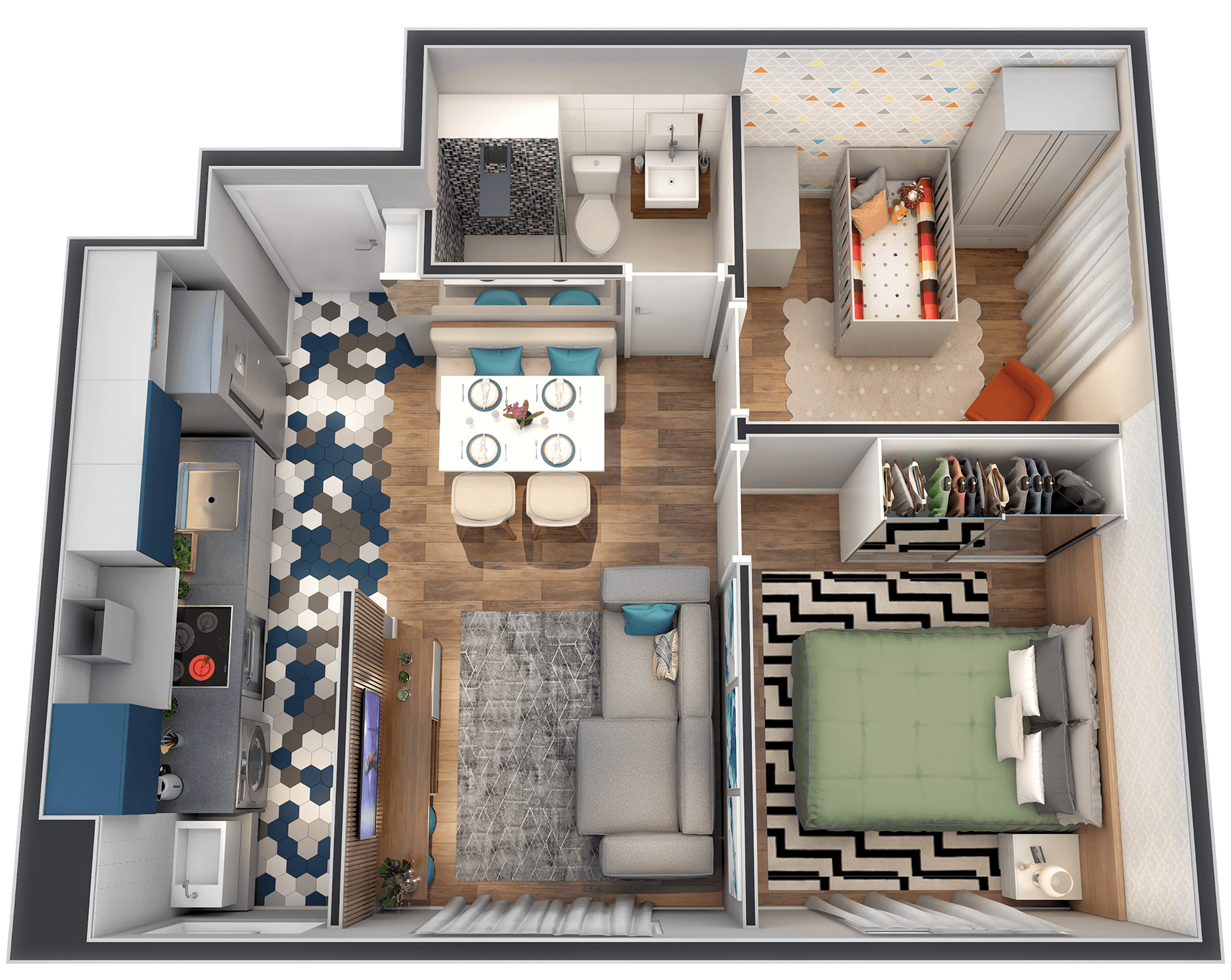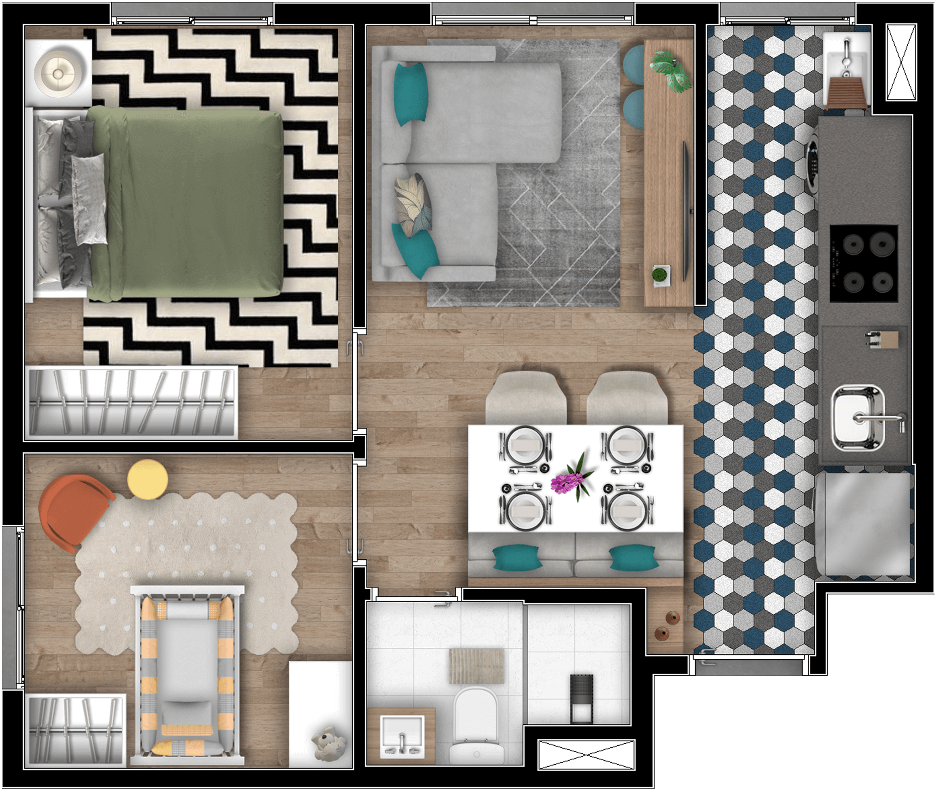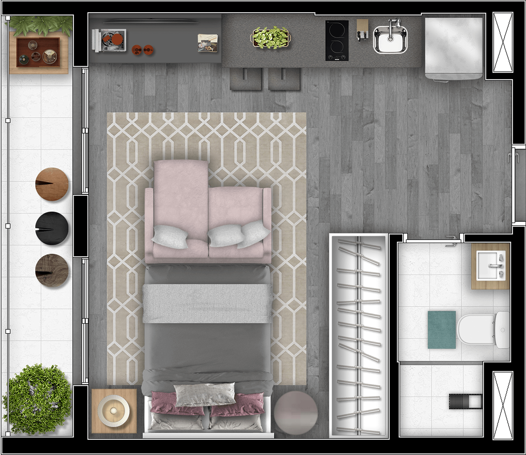 02 Dorms, sala integrada à cozinha americana, banheiro